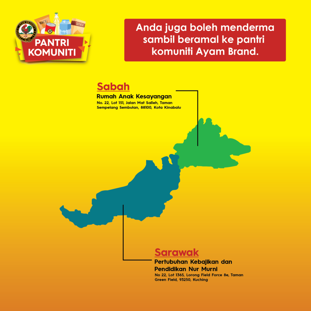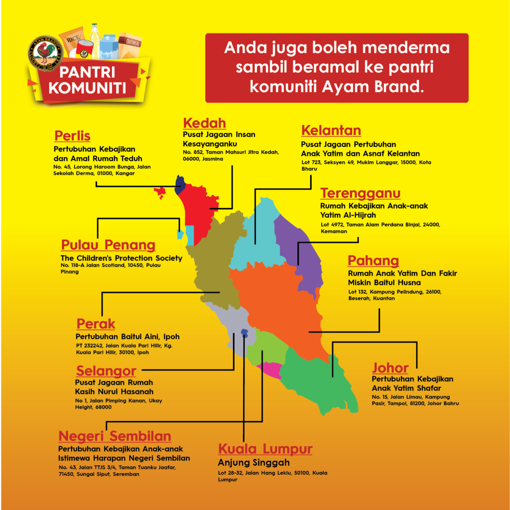Jadi sebahagian daripada gerakan untuk menerima dan menderma barang-barang keperluan pada musim Raya ini. Berikut adalah senarai lengkap lokasi-lokasi Pantri Komuniti Ayam Brand: