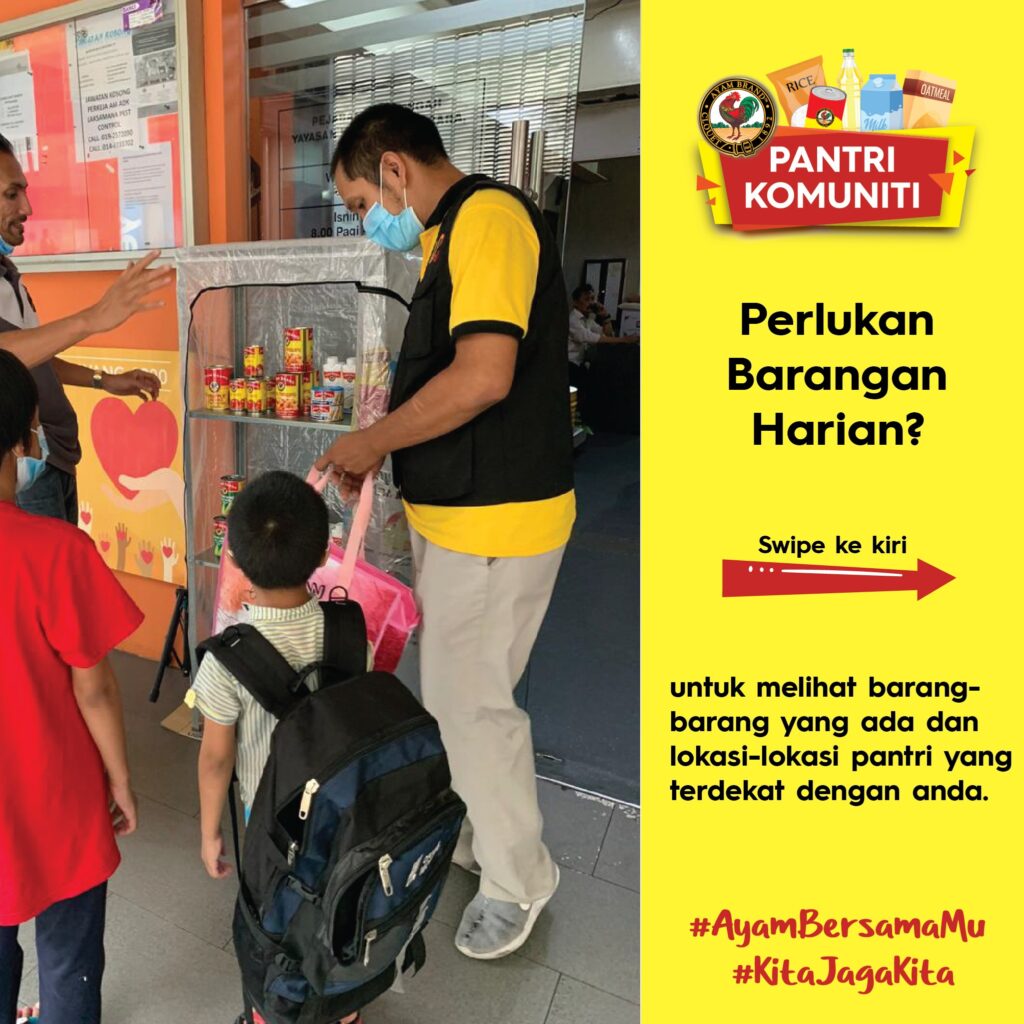 Di Kuala Lumpur, Pusat Jagaan Kasih Murni berganding bahu bersama Ayam Brand mengurus pantri komuniti setempat yang mengguna pakai konsep ‘Ambil apa yang perlu, tinggal apa yang boleh’. Pantri kalis cuaca tersebut dibekalkan dengan barangan keperluan harian seperti bekalan produk Ayam Brand. Ia dipasang di luar kawasan halaman untuk membolehkan penjarakan sosial, dan terbuka kepada umum 24 jam.
