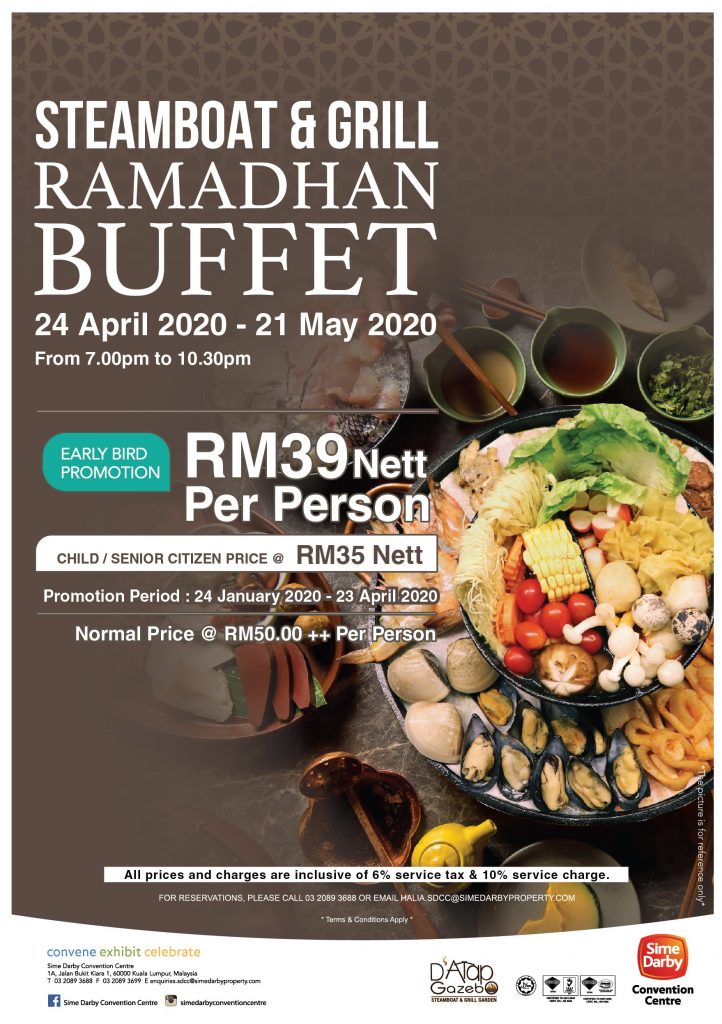 Tahun ini, D’Atap Gazebo menawarkan makanan 100 jenis barangan All-You-Can-Eat dengan hanya RM39 net seorang untuk early bird. Tempoh promosi dari 24 Januari hingga 23 April 2020 (harga normal pada RM50.00 ++ seorang). Kanak-kanak berumur antara 6 hingga 12 tahun dan warga emas berumur 60 tahun ke atas membayar hanya RM35 nett bagi setiap orang. Kanak-kanak berumur bawah 5 tahun makan secara percuma.